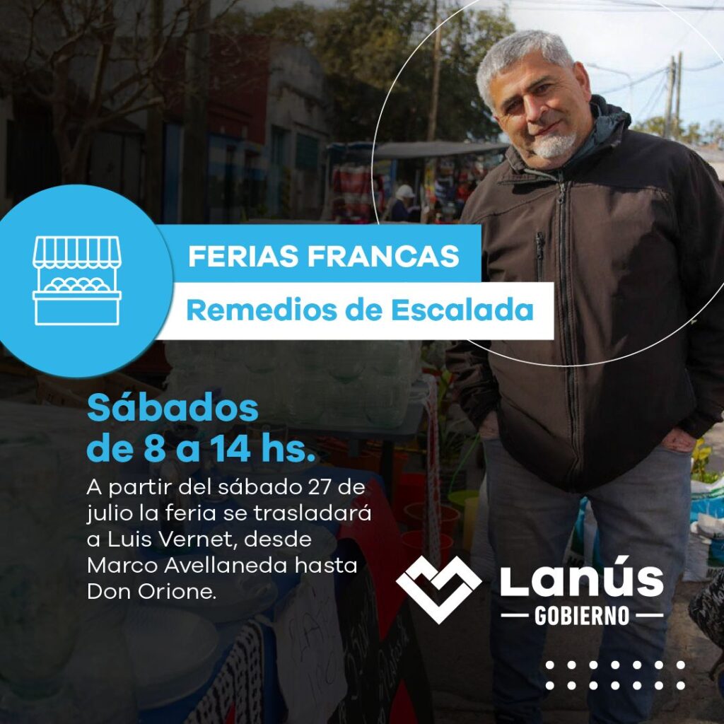 Desde el sábado 27 de julio, la Feria Franca de Remedios de Escalada se desplazará a Vernet y funcionará en el tramo de calles comprendido entre Marco Avellaneda y Don Orione. Las y los vecinos de ese barrio podrán acceder a los productos de calidad que ofrece este mercado de 8 a 14 horas.
