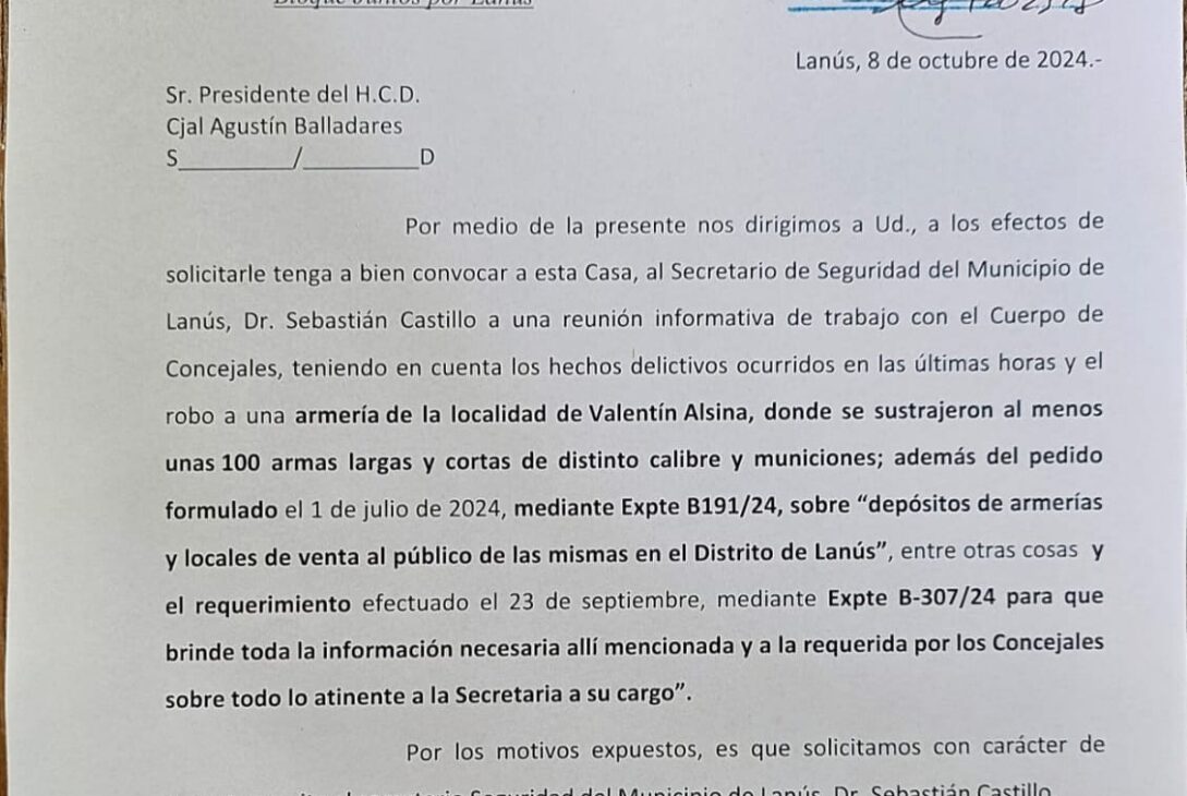 Dada la gravedad de los hechos y el creciente malestar entre los vecinos, el bloque de Juntos por Lanús ha enviado una carta formal al presidente del HCD, Agustín Balladares, exigiendo que se cite de forma urgente al Dr. Sebastián Castillo. Los concejales solicitan una reunión con carácter de prioridad para discutir no solo el robo reciente, sino también el manejo general de la seguridad en las armerías y la venta de armas en Lanús. La carta subraya que la comunidad tiene el derecho de saber si las medidas de seguridad vigentes son suficientes para prevenir futuros incidentes de este tipo.