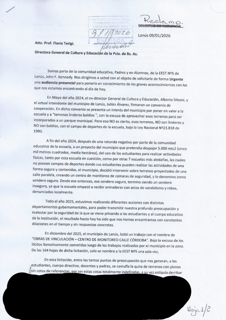 Bajo la narrativa del “pulmón verde” y la sustentabilidad, el proyecto Parque Central Las Colonias ha abierto un frente de conflicto legal y social en Lanús que parece lejos de resolverse. La Escuela de Educación Secundaria Técnica (EEST) N.º 5 “John F. Kennedy” se encuentra hoy en el epicentro de una disputa donde la seguridad de los menores y el patrimonio de la escuela pública se enfrentan a un plan de obras municipales que la comunidad califica como un “despojo encubierto”.